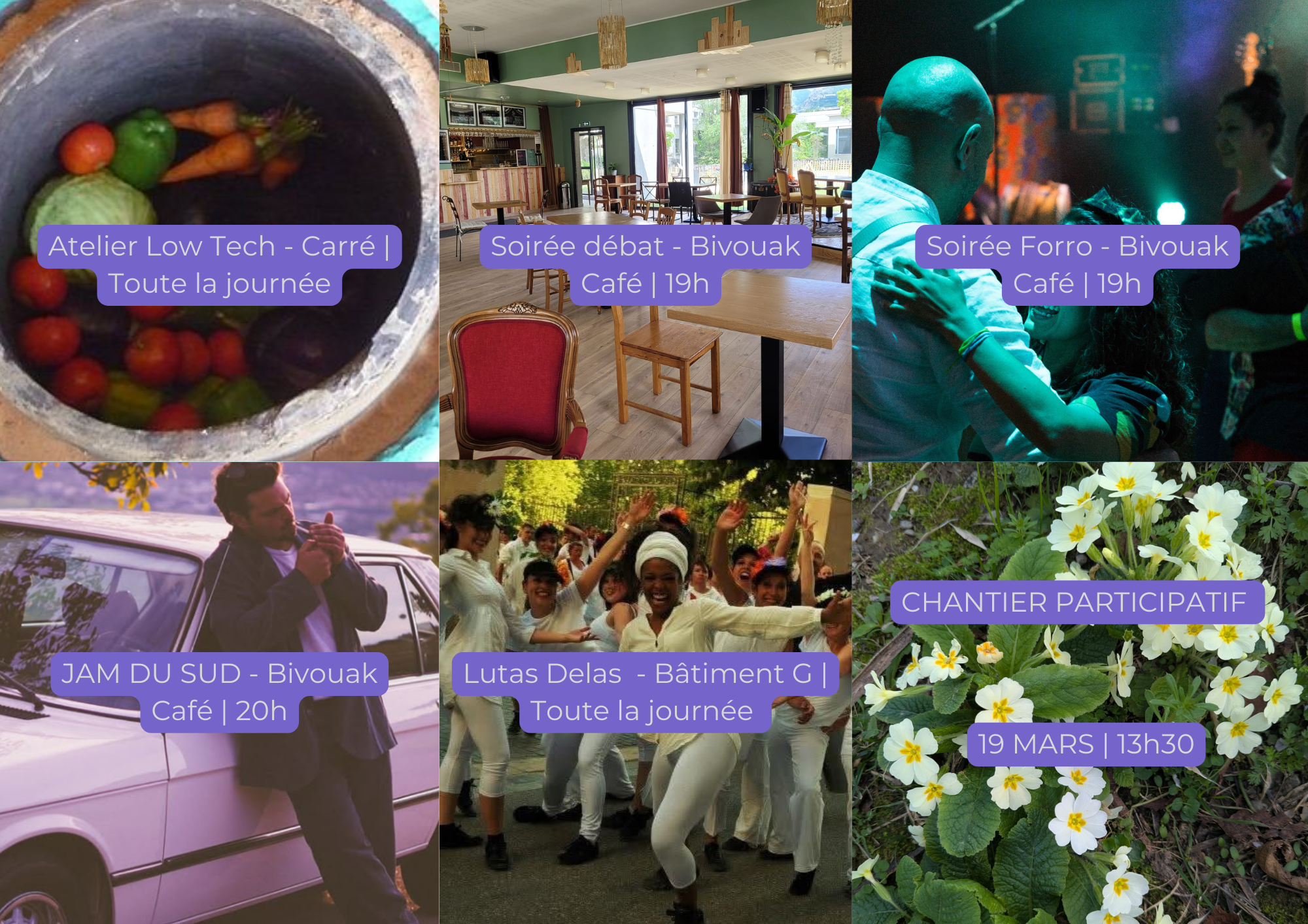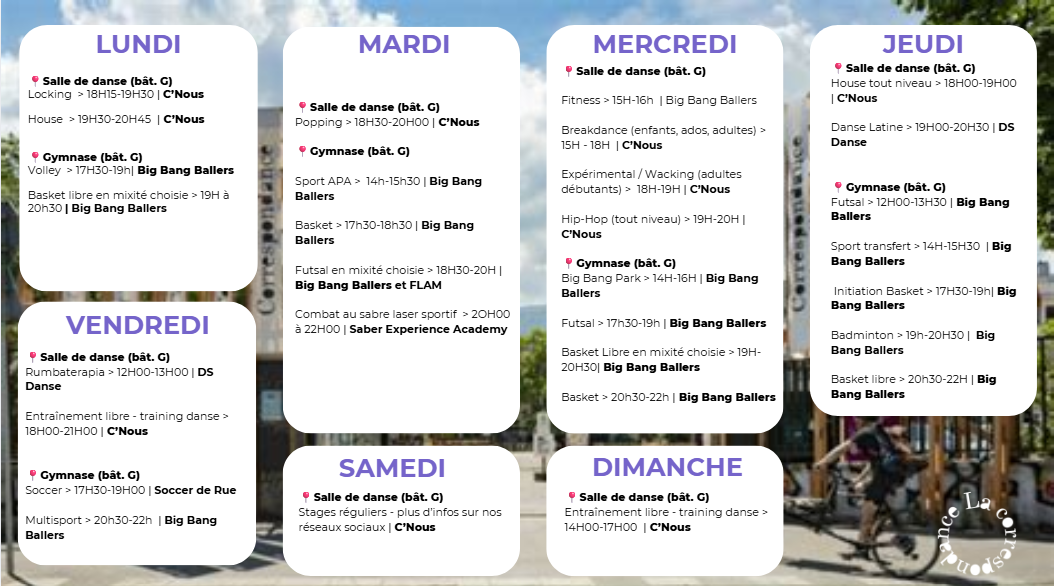 Agenda Cette semaine Les événements ponctuels : Les activités hebdomadaires de l'ANNEE Ce nouveau programme est valable jusqu’à l’été 2026! Pour plus d’informations sur les activités, vous pouvez contacter directement les associations : Big Bang Ballers Collectif C’Nous DS Danse Transe Danse Africa Soccer de Rue Tomecrit Ayakolo Eveil Doré Natur’optimisme Forro Alegre Léa Simorre
